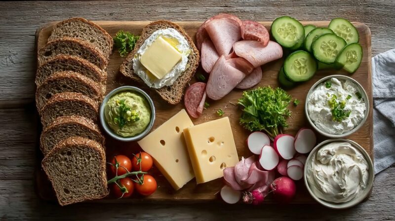 Cheese adds richness and softness, balancing salty meats and dense breads. Gouda, Emmental, Brie, Camembert, and Quark often appear as staples. Soft cheeses and dairy spreads work especially well for layering.