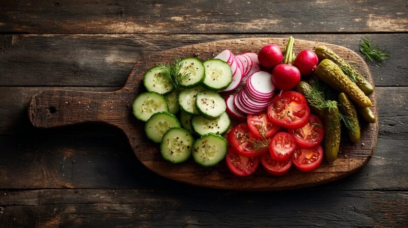 Fresh vegetables add crispness and balance. Cucumbers, tomatoes, radishes, and bell peppers appear frequently. Pickles and fermented vegetables bring sharp contrast alongside bread and meats.