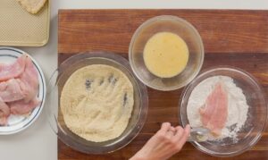- Prepare the Breading Stations:In one shallow bowl, add the flour.In a second bowl, whisk together the eggs and milk.In a third bowl, mix breadcrumbs, salt, pepper, paprika, and garlic powder.